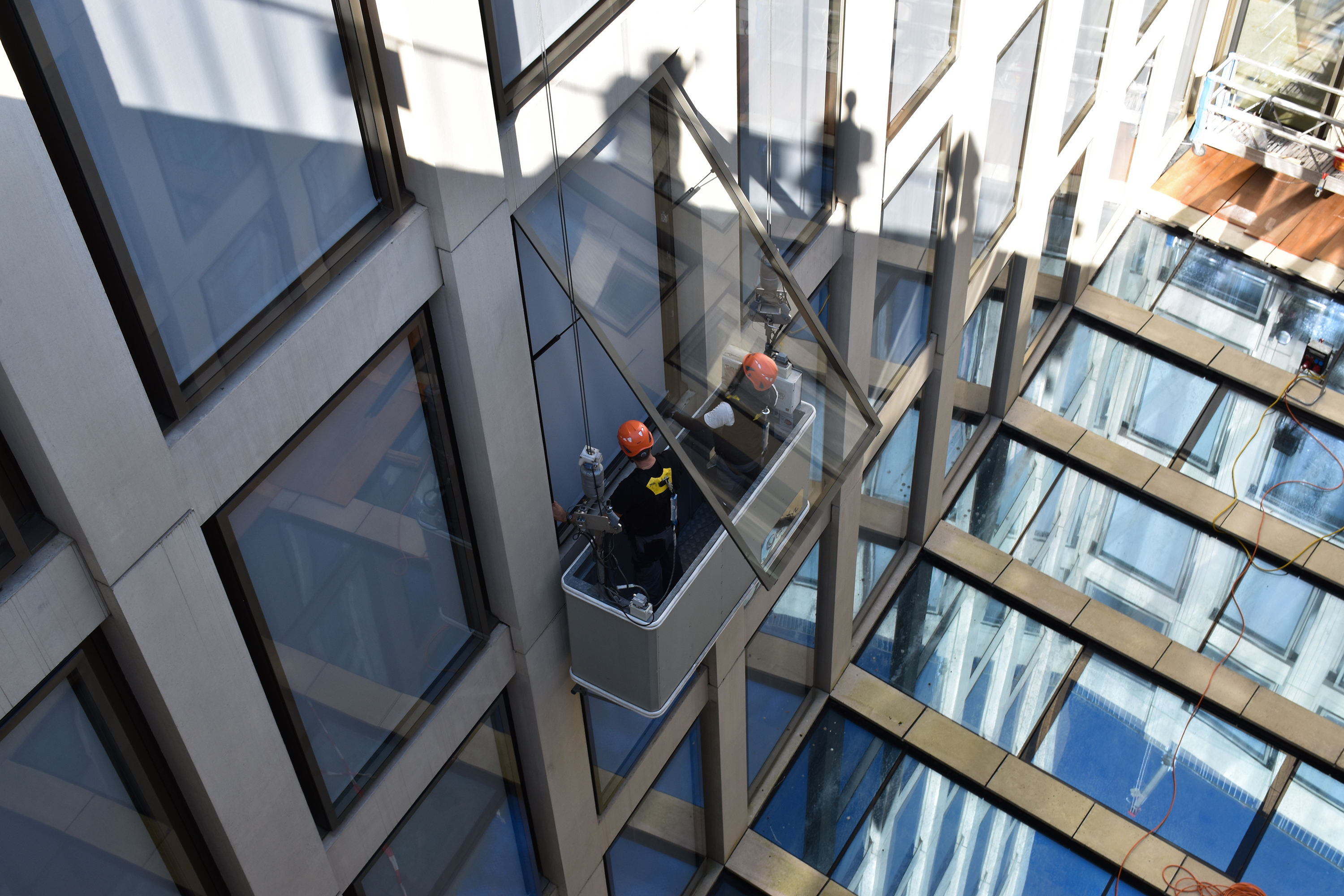 Drei Personen – davon zwei Fachkräfte im Lift und ein Zuarbeitender außerhalb – waren dafür von Mai bis September im Einsatz. Das ausführende Unternehmen war die Ammann Storen AG. Die neuen PVC-freien Beschattungsgewebe „Twilight Pearl“ stammen von der Sattler Schweiz GmbH.