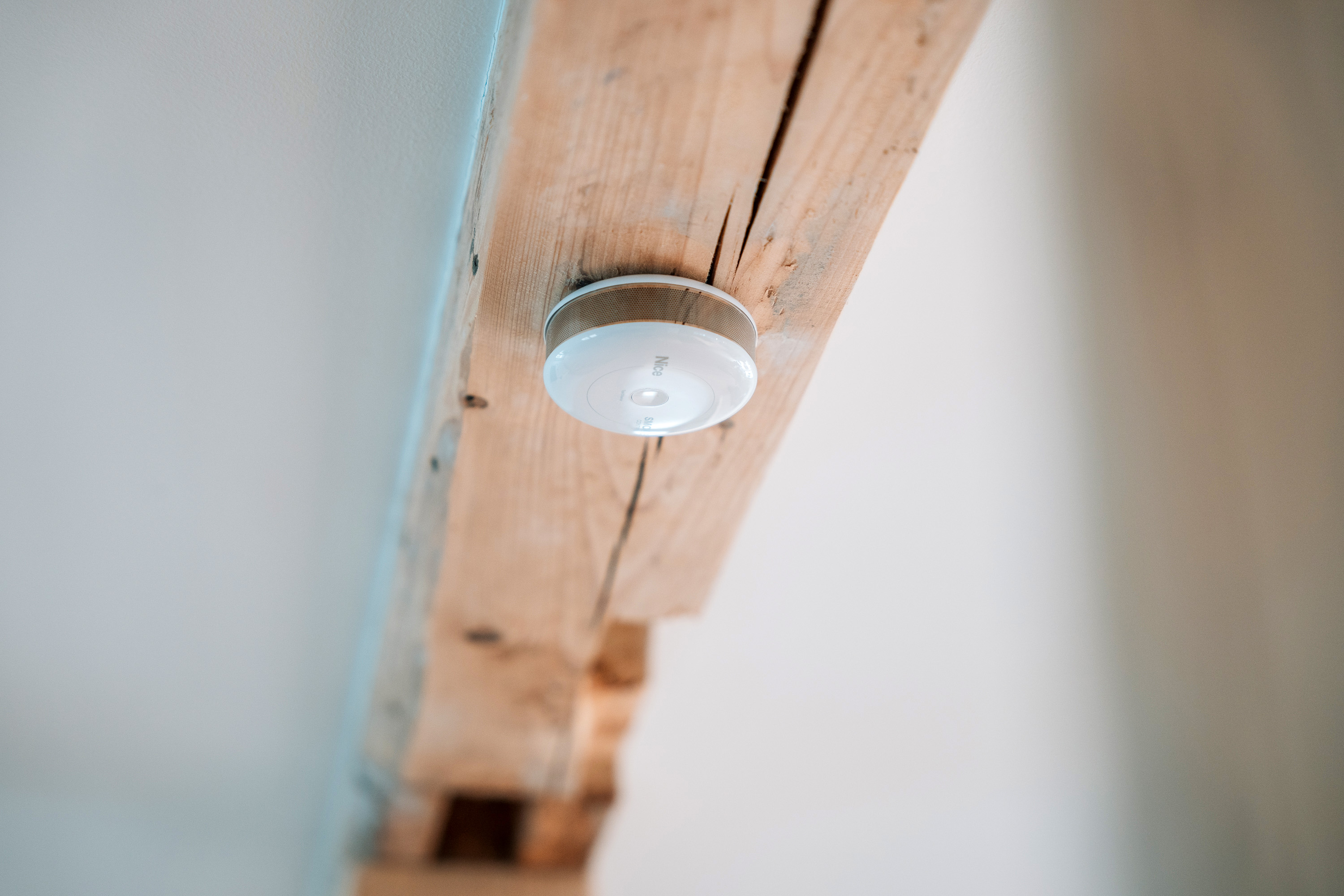 Auch die Sicherheit im Haus wurde durch die Integration smarter Sensoren erhöht. Ein Feuchtesensor – der Nice Flood-Control – schützt vor Wasserschäden im Obergeschoss, indem er bei unbemerktem Auslaufen von Wasser Alarm schlägt. Besonders vorausschauend ist auch der Smoke-Control Feuermelder, der neben der Rauchentwicklung auch Veränderungen in der Luftqualität erkennt und frühzeitig auf ein Feuer hinweist. Im Alarmfall löst das System eine automatische Reaktion aus: Alle Jalousien öffnen sich, Lichter werden eingeschaltet und die Bewohner erhalten eine Benachrichtigung auf ihr Smartphone.