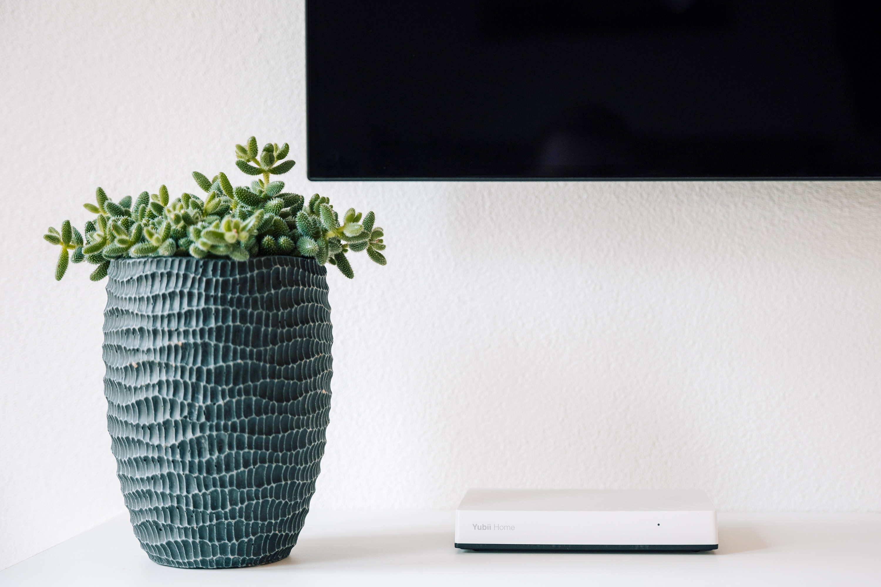 Das smarte Gateway Yubii Home, die Zentrale des Smart Home-Systems, überzeugt mit schlichtem Design und hat seinen Platz auf dem Sideboard unter dem Fernseher gefunden.